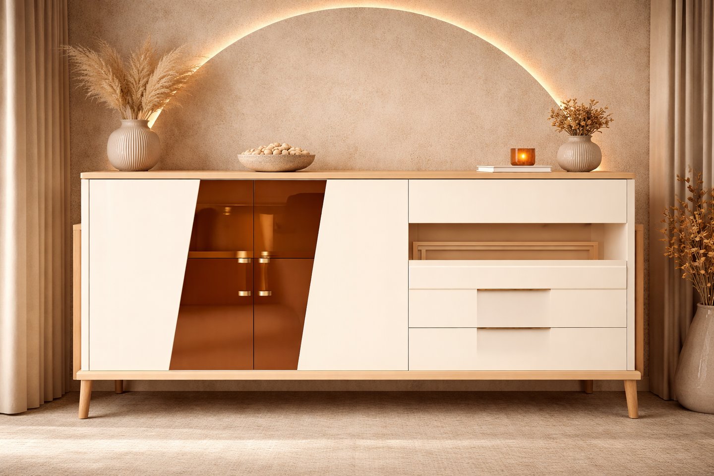 Product description: The 8729# Buffet Table is crafted to bring contemporary elegance and practical storage to your dining or living space. With its sleek design and balanced proportions, this buffet table enhances your interior while offering smart organization for everyday needs. Built with quality materials and a sturdy structure, the 8729# Buffet Table features a spacious tabletop and functional storage, making it ideal for serving, storing crockery, or displaying décor accents. Its versatile design complements modern, contemporary, and luxury interiors, suitable for both residential and hospitality environments.