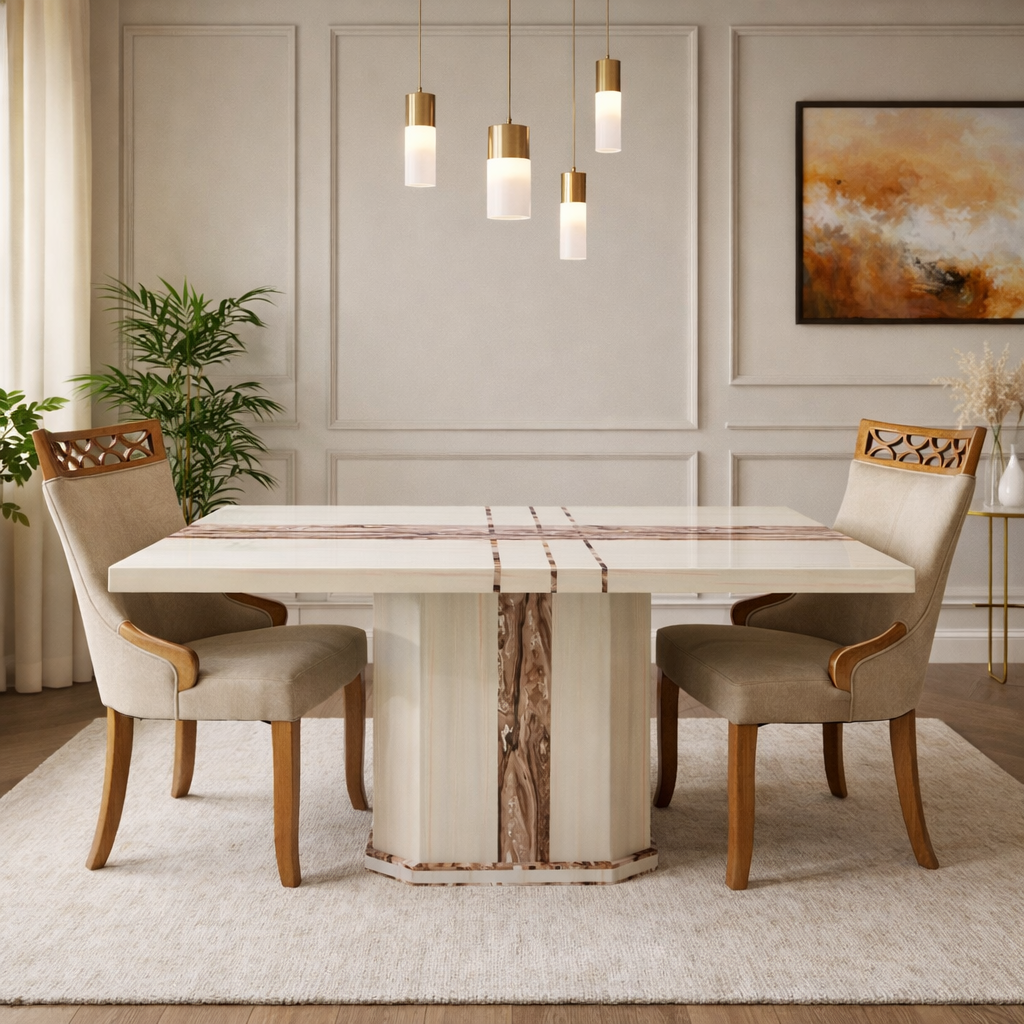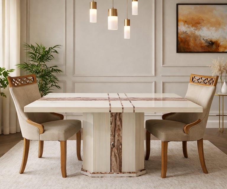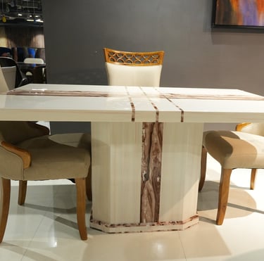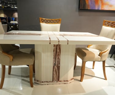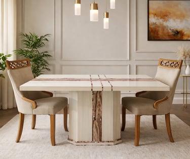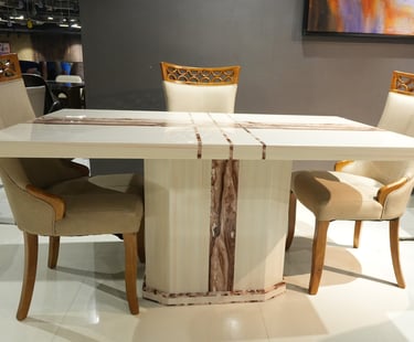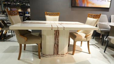 Product description: The 123 / 816 Marble Dining Set (1+4) is designed to bring timeless elegance and premium craftsmanship to compact dining spaces. This refined set includes one marble dining table paired with four comfortable dining chairs, making it ideal for apartments, small dining rooms, and intimate family gatherings. The natural marble tabletop features a smooth, polished finish that highlights the unique beauty of stone while offering durability and easy maintenance. Supported by a strong and stable base, the table ensures long-lasting performance. The four matching chairs are ergonomically designed with supportive backrests and sturdy construction, providing comfort for everyday dining. Perfect for modern, contemporary, and luxury interiors, Model 123 / 816 serves as a stylish centerpiece for elegant dining areas.