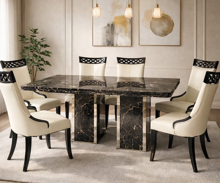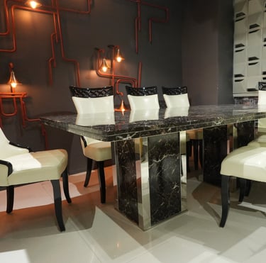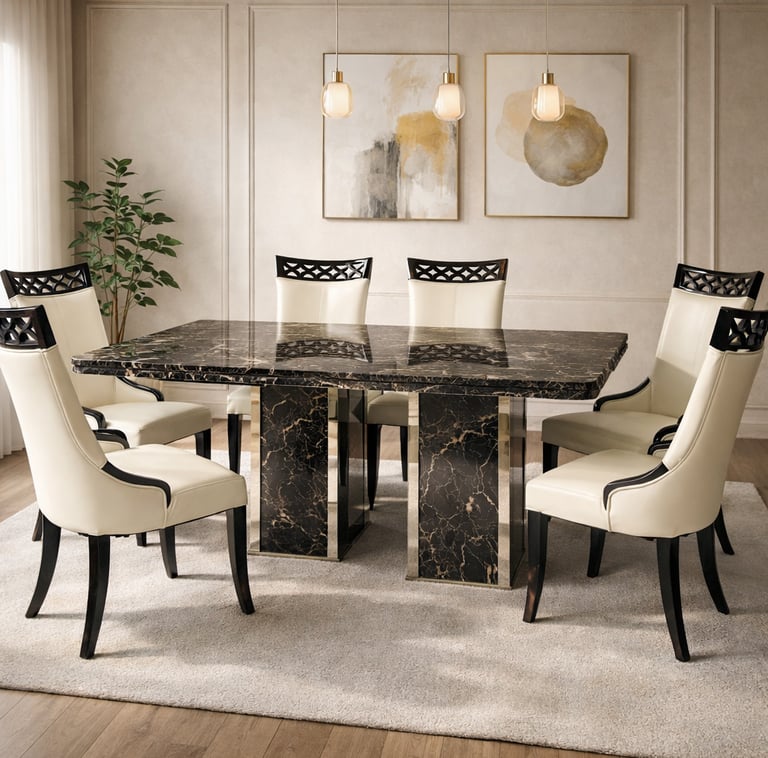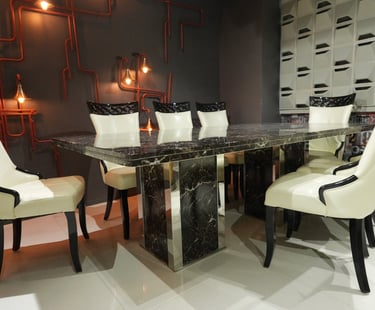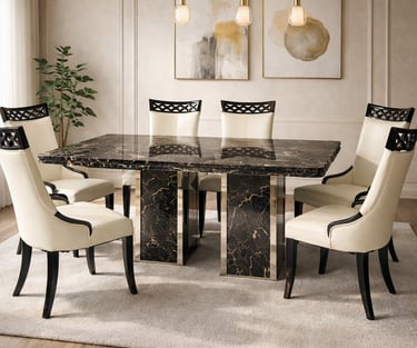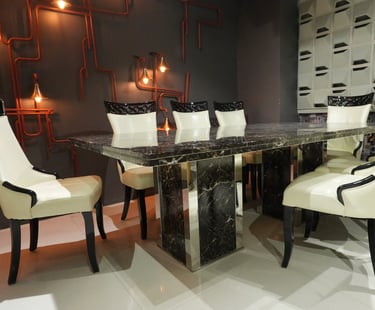 Product description: The 1823 / 816 Marble Dining Set (1+8) is crafted for grand dining spaces that demand luxury, scale, and refined elegance. This premium set includes one expansive marble dining table paired with eight beautifully designed dining chairs, making it ideal for large families, formal dinners, and sophisticated entertaining. The natural marble tabletop features a smooth, polished finish that highlights the unique veining of the stone, creating a rich and timeless centerpiece. Supported by a strong and stable base, the table is built for durability and long-term use. The eight matching chairs are ergonomically designed with supportive backrests and sturdy construction, ensuring comfort throughout extended dining experiences. Perfect for modern, contemporary, and luxury interiors, Model 1823 / 816 elevates the ambience of spacious dining rooms with its commanding presence and premium materials.