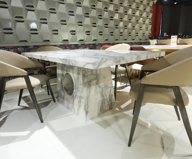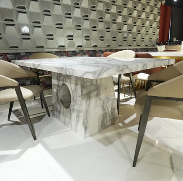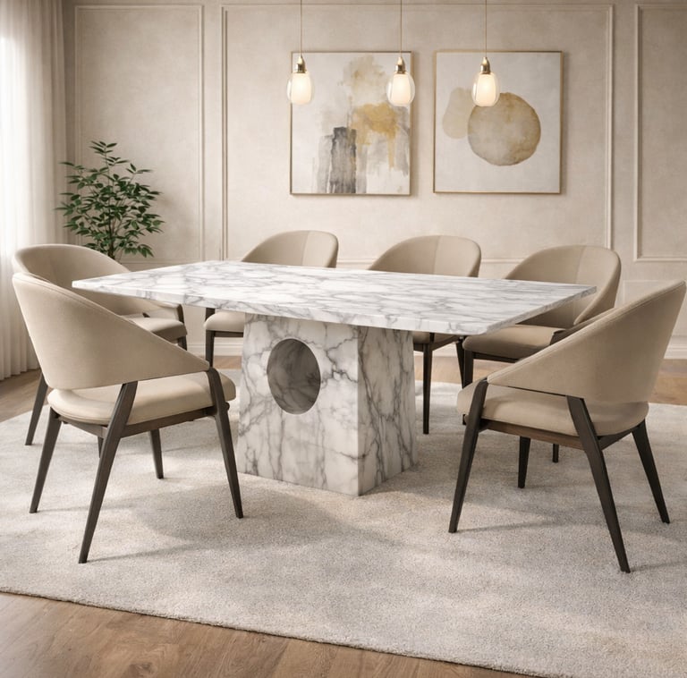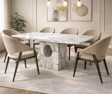 Product description: The 5501-101 / 356 Marble Dining Set (1+6) is designed to bring timeless elegance, premium craftsmanship, and everyday comfort to your dining space. This refined set includes one marble dining table paired with six comfortable dining chairs, making it ideal for family meals, gatherings, and formal entertaining. The natural marble tabletop features a smooth, polished finish that highlights the unique veining of the stone while offering durability and easy maintenance. Supported by a strong, stable base, the table is built for long-lasting performance. The six matching chairs are ergonomically designed with supportive backrests and sturdy construction, ensuring comfort during extended dining. Perfect for modern, contemporary, and luxury interiors, Model 5501-101 / 356 serves as a sophisticated centerpiece that enhances the overall ambience of your dining room.