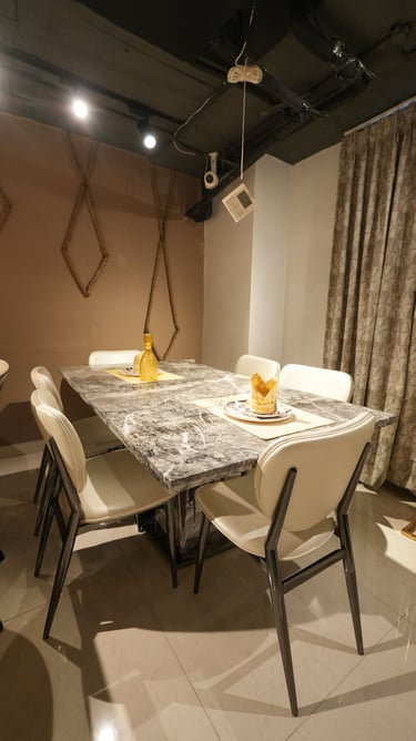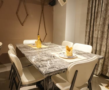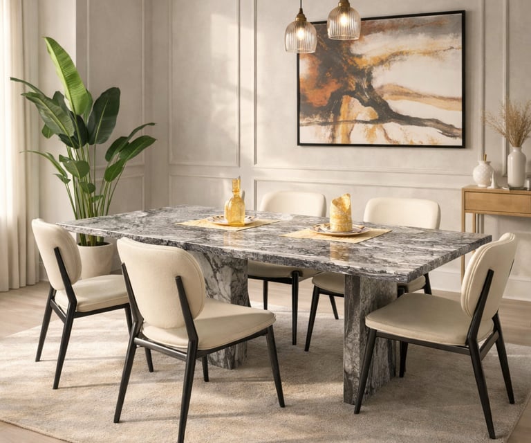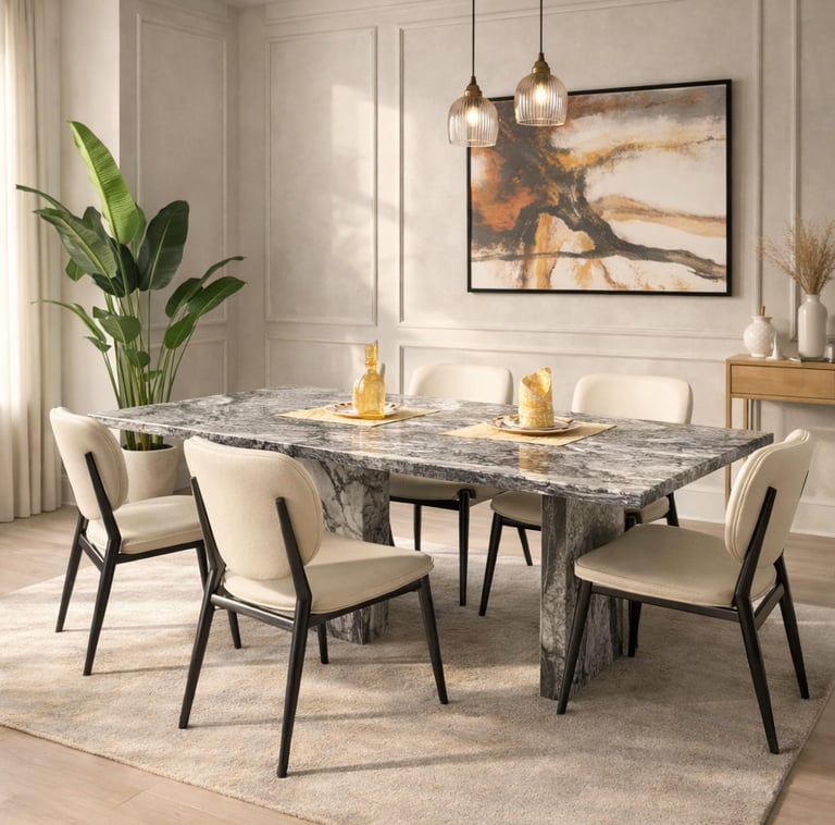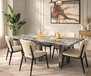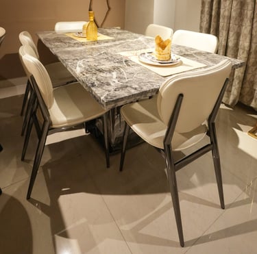 Product description: The 6004 / SY30-2 / 155-1 Marble Dining Set (1+6) is crafted to bring timeless elegance, premium materials, and everyday comfort to your dining space. This refined set includes one marble dining table paired with six comfortable dining chairs, making it perfect for family dining, social gatherings, and formal entertaining. The natural marble tabletop features a smooth, polished finish that highlights the unique veining and character of the stone, adding a luxurious touch while remaining durable and easy to maintain. Supported by a strong and stable base, the table is built for long-lasting performance. The six matching chairs are ergonomically designed with supportive backrests and sturdy construction, ensuring comfort during extended meals. Ideal for modern, contemporary, and luxury interiors, Model 6004 / SY30-2 / 155-1 serves as an elegant centerpiece that elevates the overall ambience of your dining room.