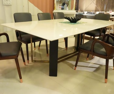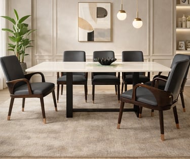 Product description: The 6070 / 260 Onyx Marble Dining Set (1+8) is an expression of rare luxury and striking elegance, crafted for grand dining spaces. This exclusive set includes one premium onyx marble dining table paired with eight elegantly designed dining chairs, making it ideal for large families, formal dinners, and high-end entertaining. The onyx marble tabletop stands out with its rich natural patterns and translucent depth, creating a dramatic and sophisticated centerpiece. Its smooth, polished surface enhances the natural beauty of the stone while offering durability for everyday dining. A strong, stable base ensures long-lasting performance. The eight matching chairs are ergonomically designed with supportive backrests and sturdy construction, providing comfort throughout extended dining experiences. Perfect for luxury, contemporary, and designer interiors, Model 6070 / 260 transforms your dining area into a statement of refined taste.