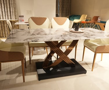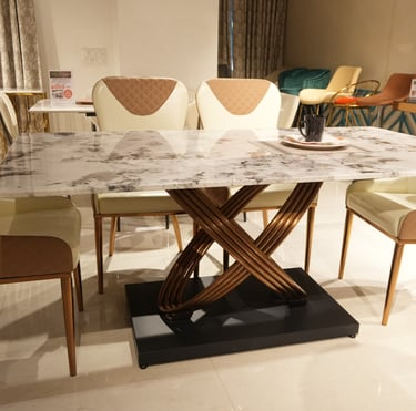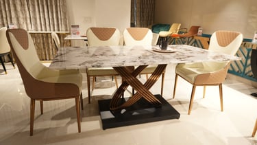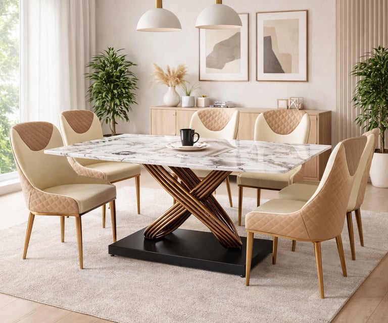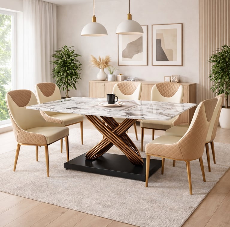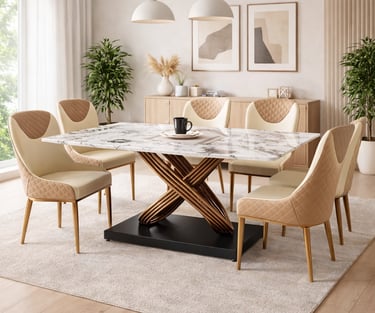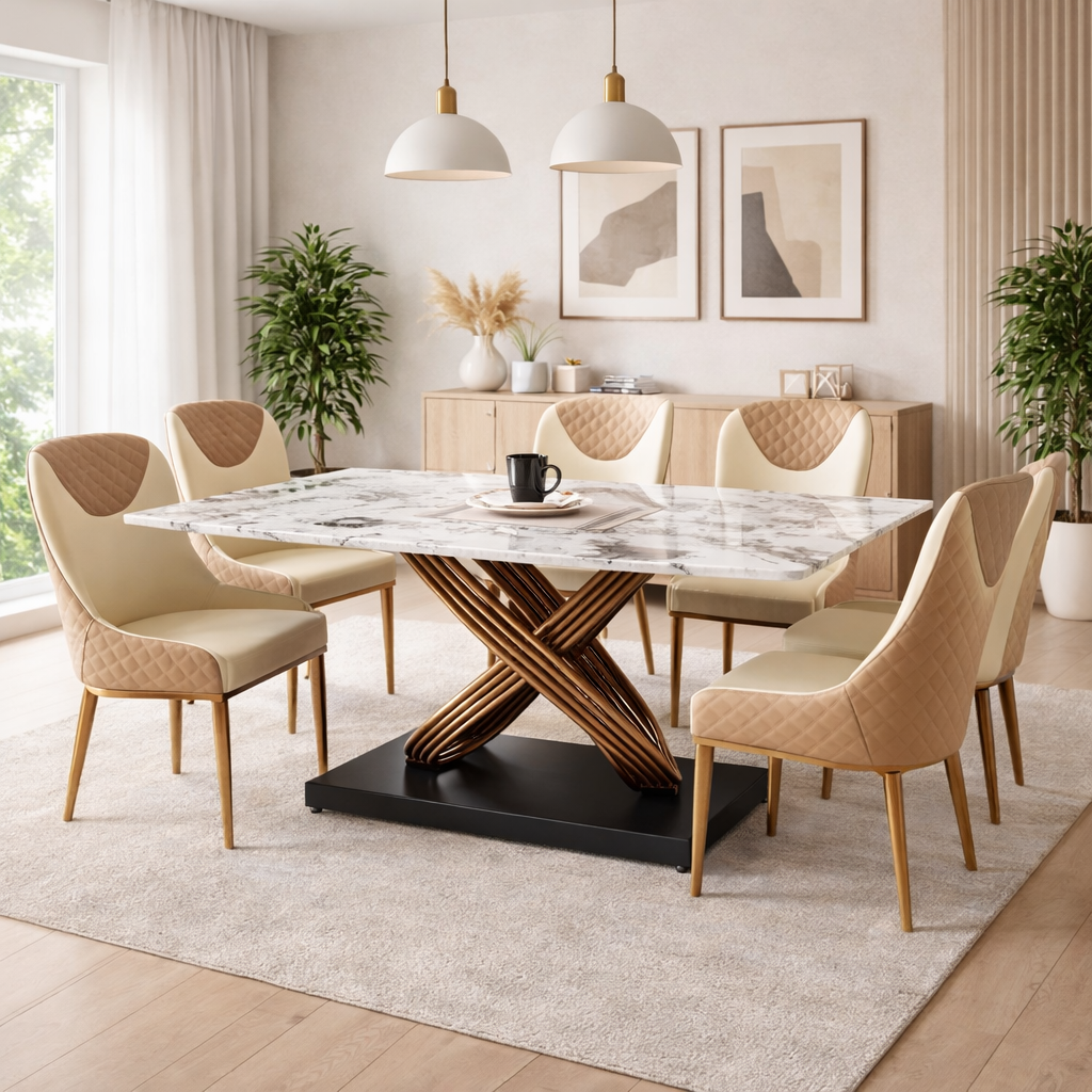 Product description: The 631 / 757-1 / A11-R / 270-26 Marble Dining Set (1+6) is crafted to bring timeless elegance, premium craftsmanship, and everyday comfort to your dining space. This refined set includes one beautifully finished marble dining table paired with six comfortable dining chairs, making it ideal for family dining, social gatherings, and formal entertaining. The natural marble tabletop features a smooth, polished finish that highlights the unique veining and character of the stone, creating a luxurious focal point while remaining durable and easy to maintain. Supported by a strong and stable base, the table is built for long-lasting performance. The six matching chairs are ergonomically designed with supportive backrests and sturdy construction, ensuring comfort during extended meals. Perfect for modern, contemporary, and luxury interiors, Model 631 / 757-1 / A11-R / 270-26 serves as an elegant centerpiece that enhances the overall ambience of your dining room.