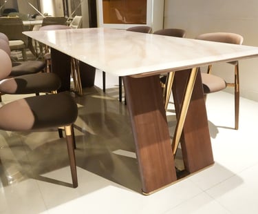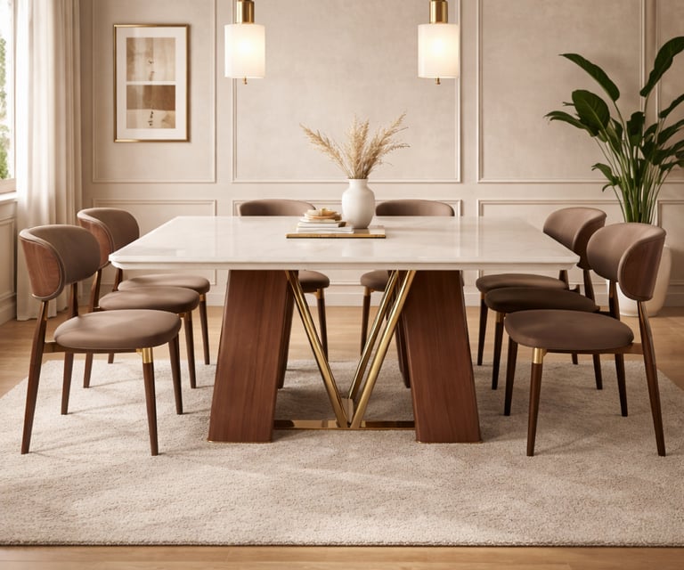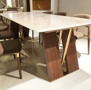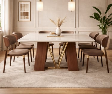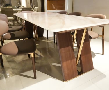 Product description: The 6651 / 6850 Natural Marble Dining Set (1+8) is a statement of timeless luxury and refined craftsmanship, designed for grand dining spaces. This premium set includes one natural marble dining table paired with eight elegantly crafted dining chairs, making it ideal for large families, formal dining, and sophisticated entertaining. The natural marble tabletop showcases authentic stone veining and a smooth, polished finish, ensuring each piece is unique while offering durability and easy maintenance. Supported by a strong and stable base, the table is built for long-lasting performance. The eight matching chairs are ergonomically designed with supportive backrests and sturdy construction, providing comfort throughout extended dining experiences. Perfect for modern, contemporary, and luxury interiors, Model 6651 / 6850 elevates the ambience of spacious dining rooms with its commanding presence and natural elegance.