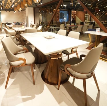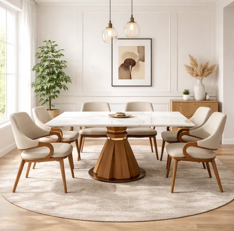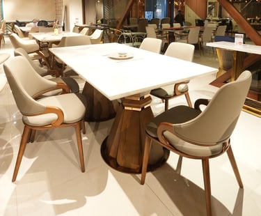 Product description: The 6657 / 654 / 8009 Marble Dining Set (1+6) is designed to bring classic elegance, premium materials, and everyday comfort to your dining space. This sophisticated set includes one beautifully crafted marble dining table paired with six comfortable dining chairs, making it ideal for family dining, celebrations, and formal entertaining. The natural marble tabletop features a smooth, polished finish that highlights the unique veining and character of the stone, adding a luxurious touch while remaining durable and easy to maintain. Supported by a strong and stable base, the table ensures long-lasting performance. The six matching chairs are ergonomically designed with supportive backrests and sturdy construction, providing comfort during extended meals. Perfect for modern, contemporary, and luxury interiors, Model 6657 / 654 / 8009 serves as an elegant centerpiece that enhances the overall ambience of your dining room.