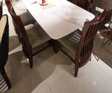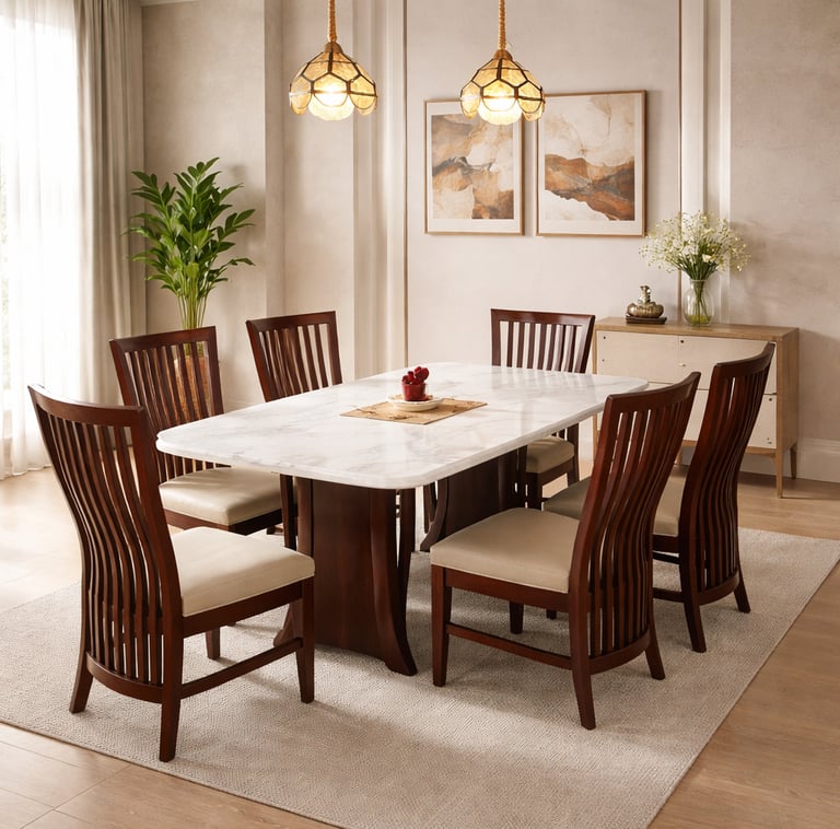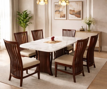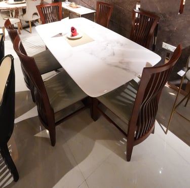 Product description: The 682 / 2053 / 626 5D Marble Dining Set (1+6) is designed to bring bold luxury, visual depth, and refined comfort to your dining space. This premium set includes one elegant 5D marble dining table paired with six stylish dining chairs, making it ideal for family dining, special occasions, and upscale entertaining. The 5D marble tabletop features enhanced depth, rich veining, and a high-gloss polished finish that creates a striking, contemporary look while remaining durable and easy to maintain. Supported by a strong and stable base, the table ensures long-lasting performance. The six matching chairs are ergonomically designed with supportive backrests and sturdy construction, offering comfort throughout extended meals. Perfect for modern, contemporary, and luxury interiors, Model 682 / 2053 / 626 serves as a sophisticated centerpiece that elevates the overall dining ambience.