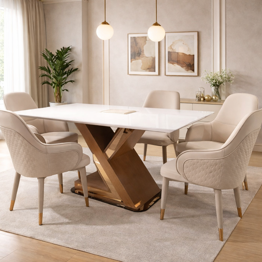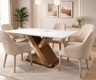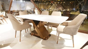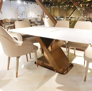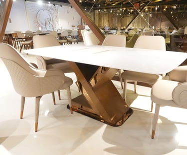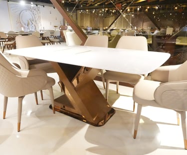 Product description: The 682 / 8-012 / 610-R 5D Onyx Marble Dining Set (1+6) is a luxurious centerpiece crafted for refined dining spaces that demand exclusivity and visual impact. This premium set includes one 5D onyx marble dining table paired with six elegantly designed dining chairs, ideal for family dining, celebrations, and high-end entertaining. The 5D onyx marble tabletop features enhanced depth, rich natural patterns, and a high-gloss polished finish that creates a dramatic, premium look. The unique translucency and veining of onyx marble elevate the dining experience while maintaining durability and ease of maintenance. A strong, stable base ensures long-lasting performance, while the six matching chairs provide ergonomic support and comfortable seating for extended meals. Perfect for luxury, contemporary, and designer interiors, Model 682 / 8-012 / 610-R transforms your dining area into a statement of elegance and sophistication.