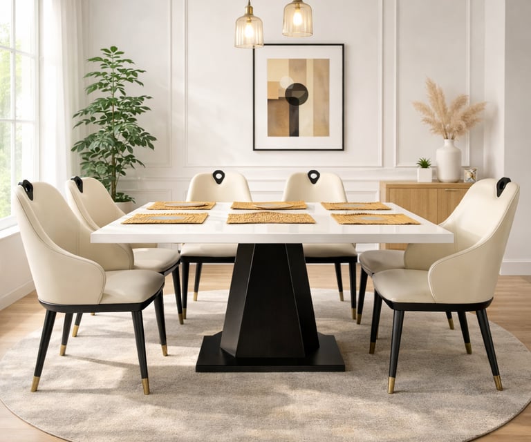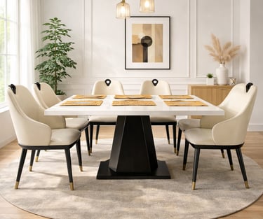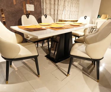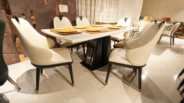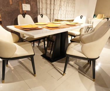 Product description: The 687 / 8-03 Marble Dining Set (1+6) is thoughtfully designed to bring timeless elegance, premium materials, and everyday comfort to your dining space. This refined set includes one marble dining table paired with six comfortable dining chairs, making it ideal for family meals, social gatherings, and formal entertaining. The natural marble tabletop features a smooth, polished finish that highlights the unique veining and character of the stone, creating a luxurious focal point while remaining durable and easy to maintain. Supported by a strong and stable base, the table ensures long-lasting performance. The six matching chairs are ergonomically designed with supportive backrests and sturdy construction, offering comfort during extended dining experiences. Perfect for modern, contemporary, and luxury interiors, Model 687 / 8-03 serves as an elegant centerpiece that enhances the overall ambience of your dining room.