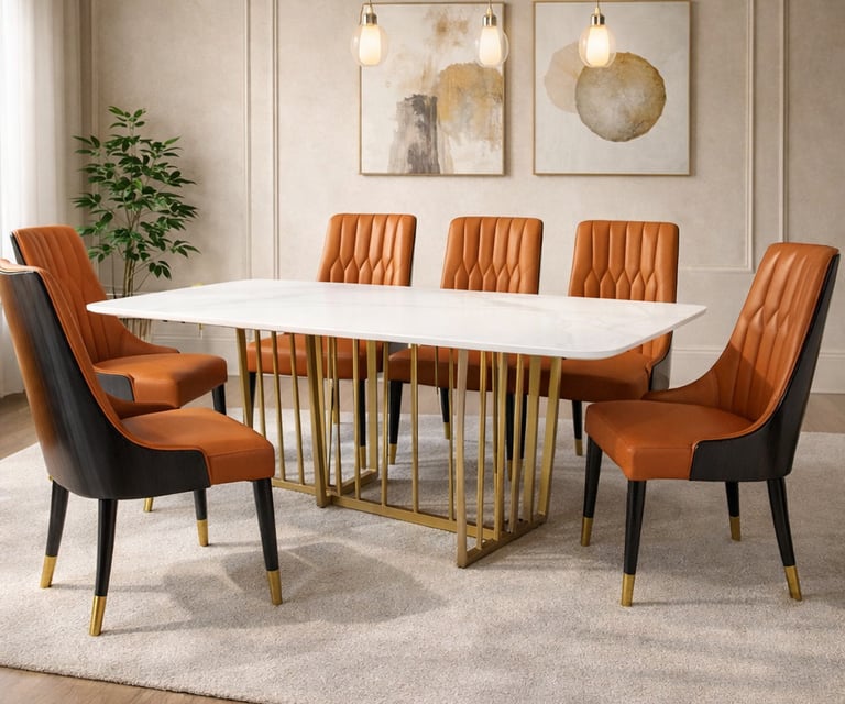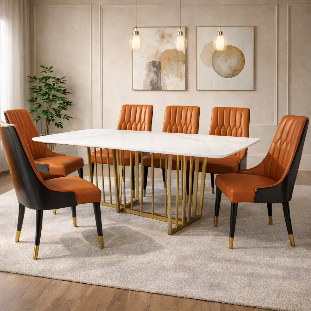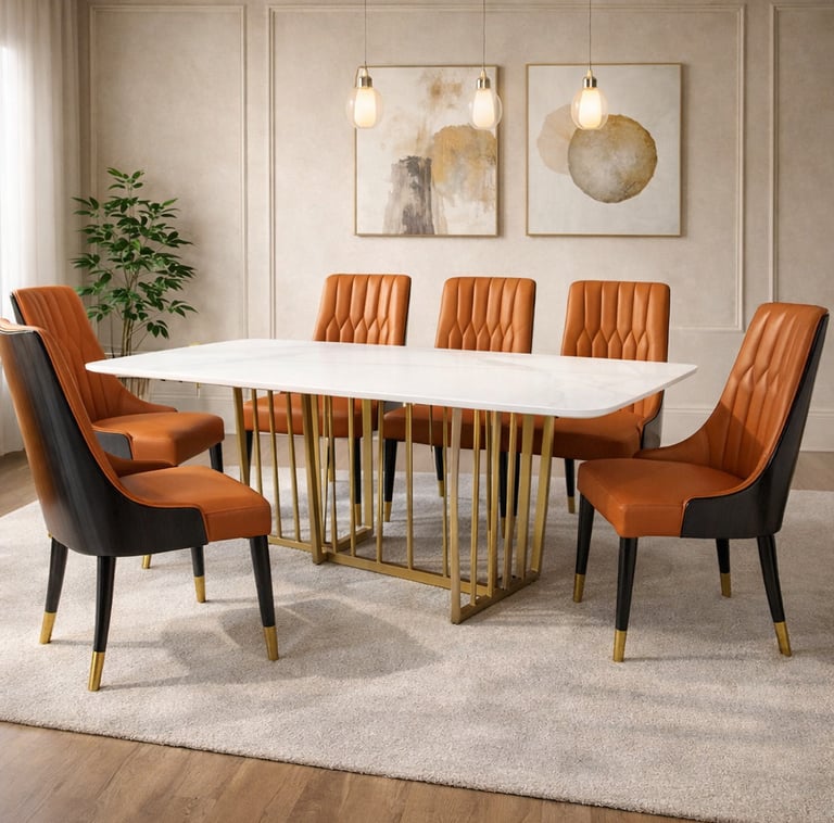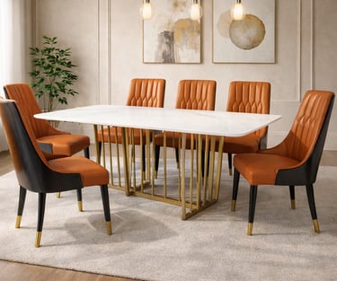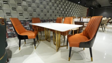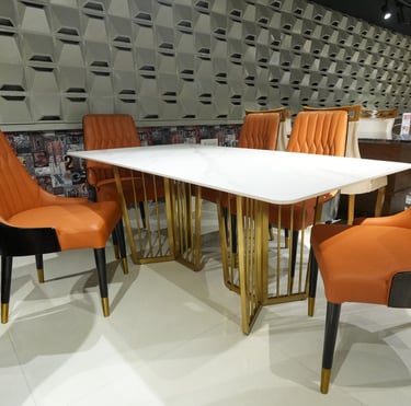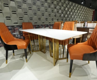 Product description: The 8606 / 277 Sintered Stone Dining Set (1+6) is designed to bring modern sophistication, superior durability, and refined elegance to your dining space. This premium set includes one sintered stone dining table paired with six stylish dining chairs, making it ideal for everyday family dining as well as elegant entertaining. The sintered stone tabletop offers a sleek, luxurious appearance while being highly resistant to scratches, heat, stains, and moisture, ensuring long-lasting beauty with minimal maintenance. Supported by a strong and stable base, the table is built for durability and everyday use. The six matching chairs are ergonomically designed with supportive backrests and sturdy construction for comfortable dining experiences. Perfect for modern, contemporary, and luxury interiors, Model 8606 / 277 serves as a striking centerpiece for stylish dining rooms.