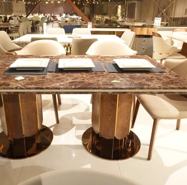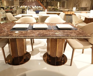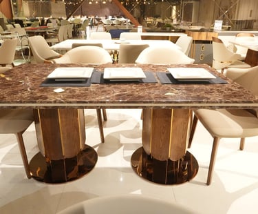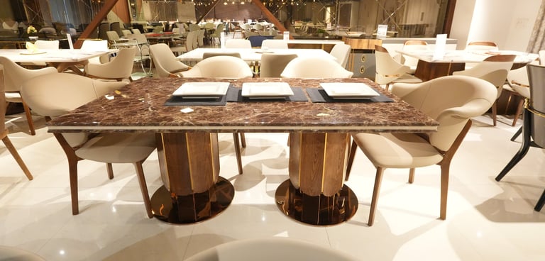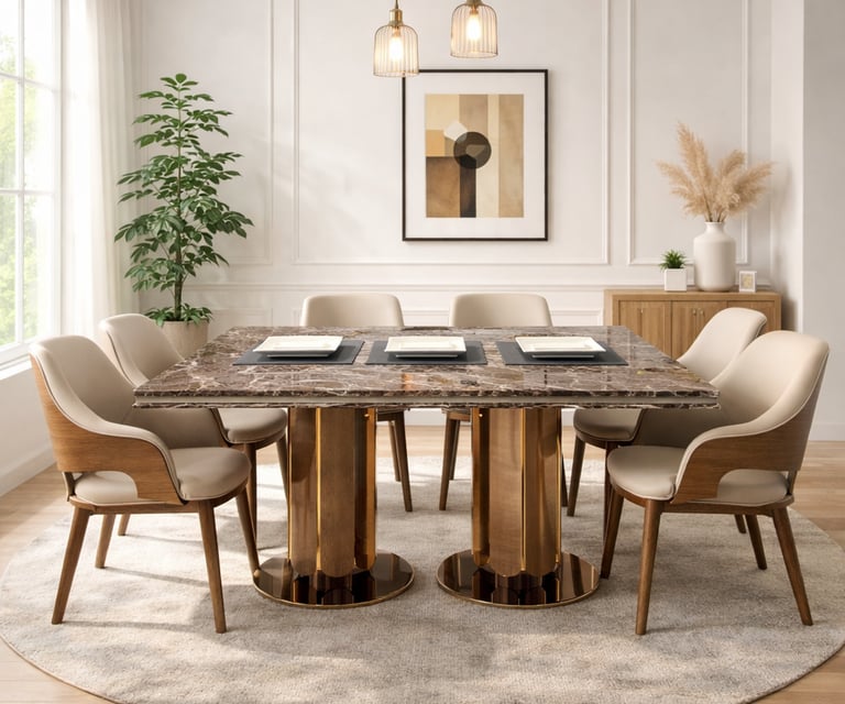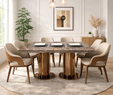 Product description: The 870 / -3 / 2508B Marble Dining Set (1+6) is crafted to bring timeless elegance, premium materials, and everyday comfort to your dining space. This sophisticated set includes one marble dining table paired with six well-designed dining chairs, making it perfect for family dining, social gatherings, and formal entertaining. The natural marble tabletop features a smooth, polished finish that highlights the unique veining of the stone, adding a luxurious focal point while remaining durable and easy to maintain. Supported by a strong and stable base, the table is built for long-term use. The six matching chairs are ergonomically designed with supportive backrests and sturdy construction, ensuring comfort during extended meals. Ideal for modern, contemporary, and luxury interiors, Model 870 / -3 / 2508B serves as an elegant centerpiece that enhances the overall ambience of your dining room.