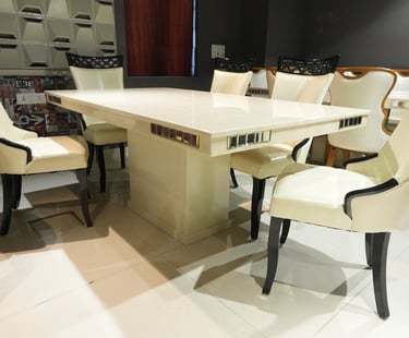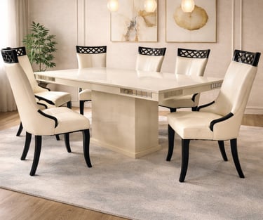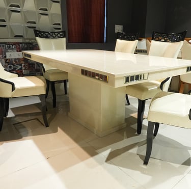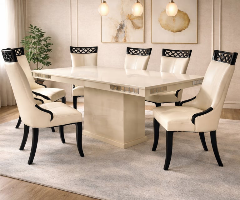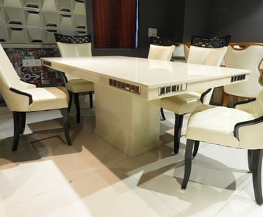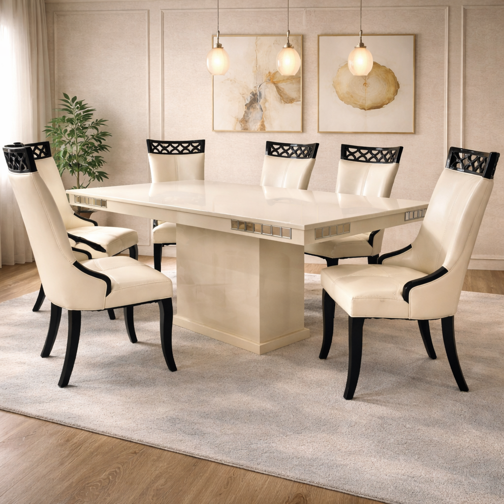Product description: The 887 / 816 Dining Table Set (1+6) is designed to offer a perfect balance of style, comfort, and everyday functionality. This elegant set includes one dining table paired with six comfortable dining chairs, making it ideal for family meals, gatherings, and entertaining guests. Crafted with quality materials and a sturdy structure, the dining table provides a spacious surface for dining while ensuring long-lasting durability. The six matching chairs are thoughtfully designed with supportive backrests and stable construction to provide comfortable seating during extended meals. With its clean lines and versatile design, Model 887 / 816 blends seamlessly into modern, contemporary, and classic dining interiors.
