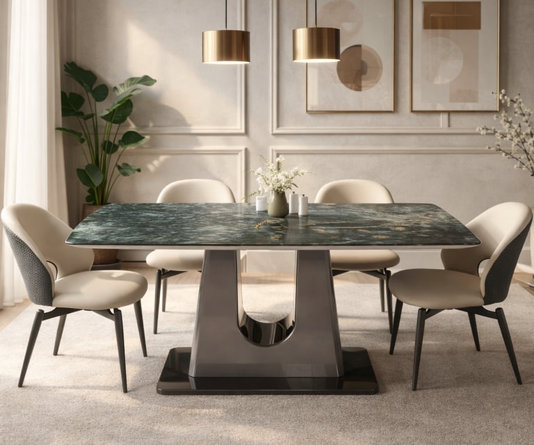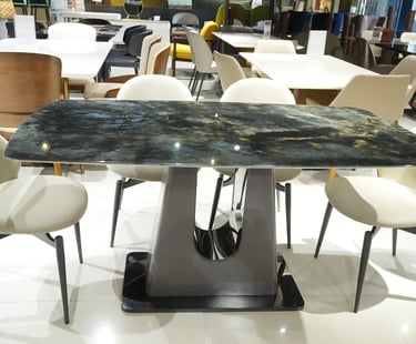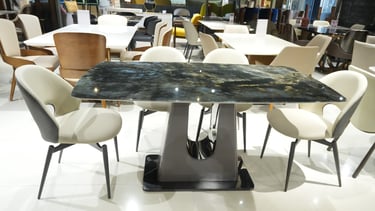Product description: The C161 / OMX14 Marble Dining Set (1+6) is designed to bring timeless elegance, premium craftsmanship, and everyday comfort to your dining space. This refined set includes one marble dining table paired with six comfortable dining chairs, making it ideal for family dining, gatherings, and formal entertaining. The natural marble tabletop features a smooth, polished finish that highlights the unique veining of the stone, adding a luxurious touch while remaining durable and easy to maintain. Supported by a strong and stable base, the table ensures long-lasting performance. The six matching chairs are ergonomically designed with supportive backrests and sturdy construction, providing comfort throughout extended meals. Perfect for modern, contemporary, and luxury interiors, Model C161 / OMX14 serves as a sophisticated centerpiece that elevates the ambience of your dining room.