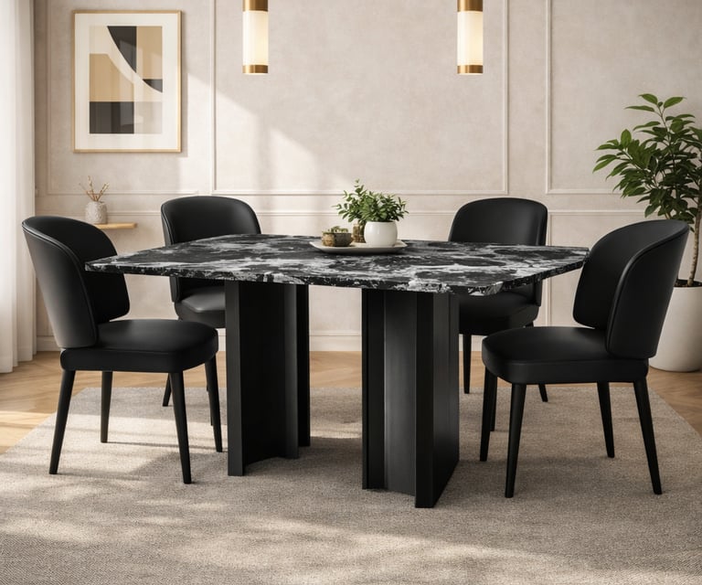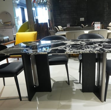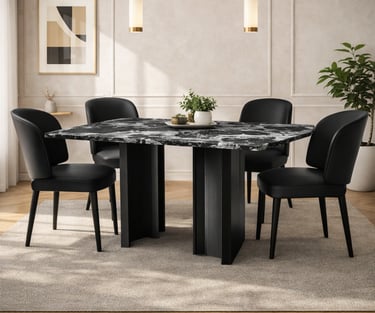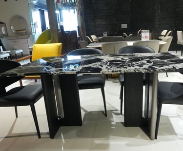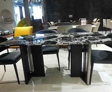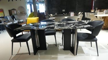 Product description: The YT04 / F04 Marble Dining Set (1+6) is crafted to bring refined luxury and timeless elegance to your dining space. This premium set includes one beautifully finished marble dining table and six matching dining chairs, making it ideal for family meals, formal gatherings, and stylish entertaining. The natural marble tabletop showcases unique stone patterns with a smooth, polished finish that adds sophistication while remaining durable and easy to maintain. Supported by a strong and stable base, the table is built for long-lasting use. The six chairs are ergonomically designed to provide excellent comfort, with supportive backrests and sturdy construction. Perfect for modern, contemporary, and luxury interiors, Model YT04 / F04 serves as a striking centerpiece for elegant dining rooms.