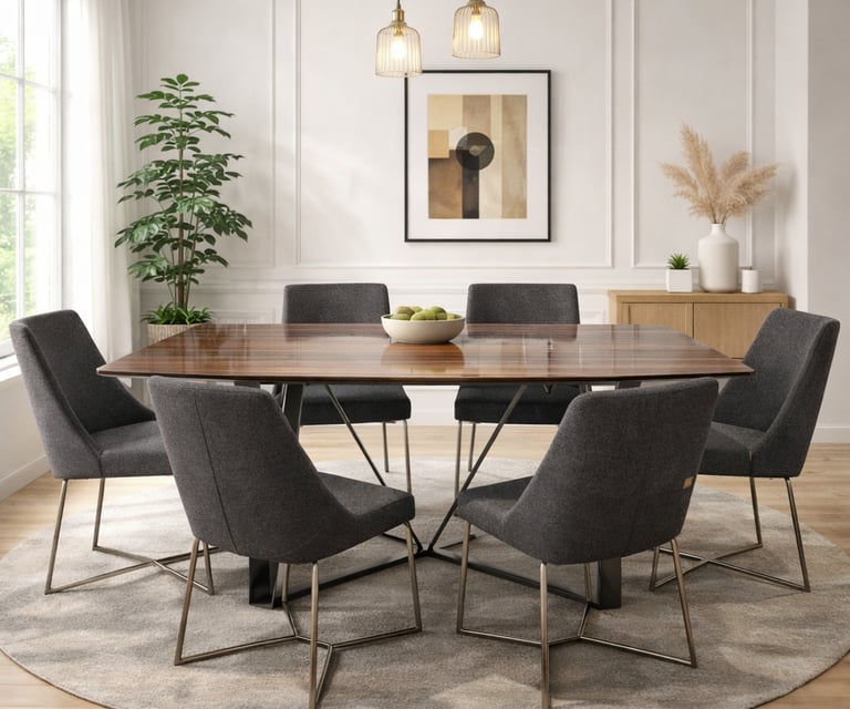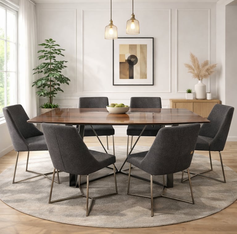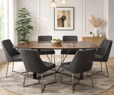 Product description: The Elegant Prada Turkey Dining Set (1+6) is a perfect blend of European sophistication, premium craftsmanship, and timeless luxury. Designed with refined aesthetics inspired by Italian–Turkish elegance, this dining set brings a high-end, designer feel to your dining space. This exclusive set includes one beautifully crafted dining table paired with six elegant dining chairs, offering both visual appeal and exceptional comfort. The table features a sleek, polished finish with luxurious detailing, while the chairs are ergonomically designed with plush seating and supportive backrests—ideal for long, relaxed dining experiences. Perfect for luxury homes, designer apartments, and premium dining interiors, the Elegant Prada dining set stands out as a statement of class and modern refinement.