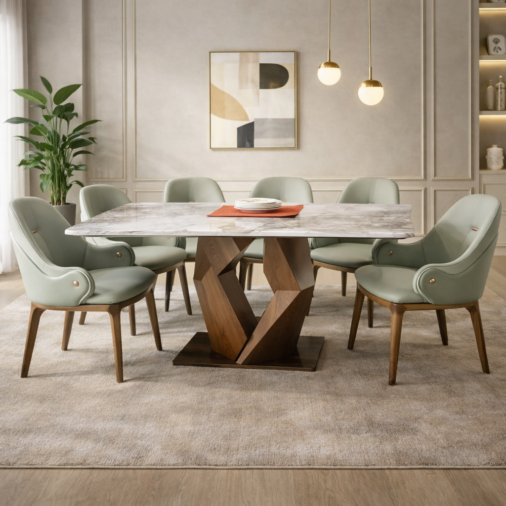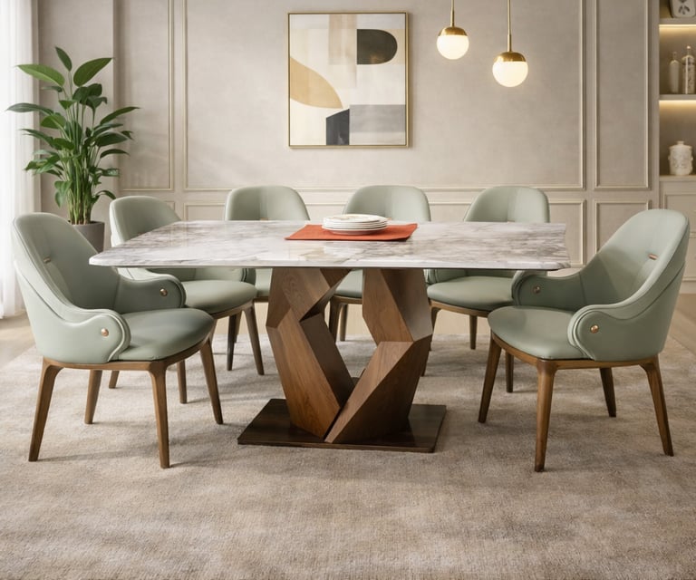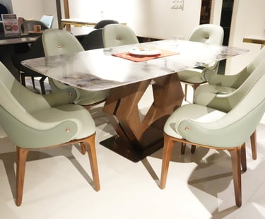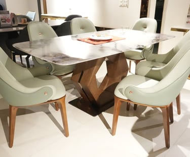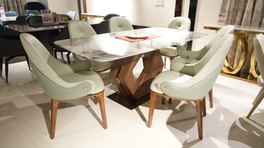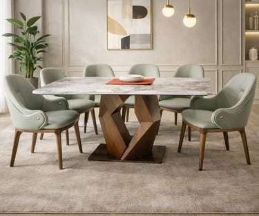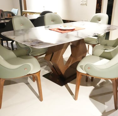 Product description: The H15 / F02 / 623 Marble Dining Set (1+6) is designed to bring timeless elegance, premium craftsmanship, and everyday comfort to your dining space. This sophisticated set includes one beautifully finished marble dining table paired with six comfortable dining chairs, making it ideal for family dining, gatherings, and formal entertaining. The natural marble tabletop features a smooth, polished finish that highlights the unique veining of the stone, adding a luxurious touch while remaining durable and easy to maintain. Supported by a strong and stable base, the table ensures long-lasting performance. The six matching chairs are ergonomically designed with supportive backrests and sturdy construction, providing comfort throughout extended meals. Perfect for modern, contemporary, and luxury interiors, Model H15 / F02 / 623 serves as a refined centerpiece that elevates the overall ambience of your dining room.