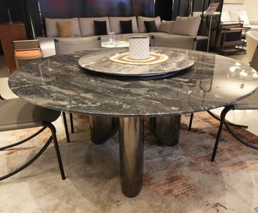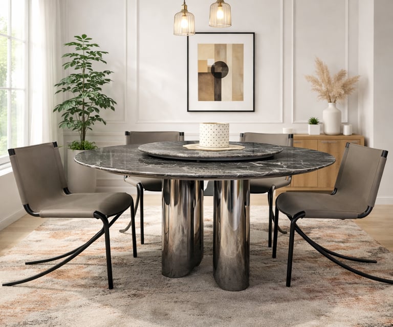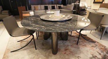 Product description: The KT-8338 / KY-2133 Marble Dining Set (1+6) is designed to bring timeless elegance and a warm, inviting dining experience to your home. Featuring a round marble dining table paired with six comfortable dining chairs, this set encourages easy conversation and balanced seating—perfect for family meals and social gatherings. The premium marble tabletop showcases natural stone veining with a smooth, polished finish that adds luxury while remaining durable and easy to maintain. The round design enhances flow and space efficiency, while the strong, stable base ensures long-lasting performance. The six matching chairs are ergonomically designed with supportive backrests and sturdy construction for extended comfort. Ideal for modern, contemporary, and luxury interiors, this dining set serves as a refined centerpiece for elegant dining spaces.