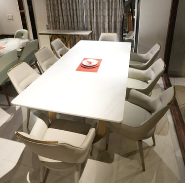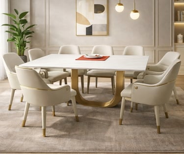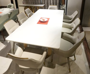 Product description: The S000 / 865 / B609-1 Marble Dining Set (1+8) is designed for grand dining spaces that demand luxury, scale, and refined craftsmanship. This premium set includes one expansive marble dining table paired with eight elegantly designed dining chairs, making it ideal for large families, formal dinners, and sophisticated entertaining. The natural marble tabletop features a smooth, polished finish that highlights distinctive stone veining, creating a timeless and impressive centerpiece. Supported by a strong and stable base, the table ensures durability and long-term performance. The eight matching chairs are ergonomically designed with supportive backrests and sturdy construction, providing comfort throughout extended dining experiences. Perfect for modern, contemporary, and luxury interiors, Model S000 / 865 / B609-1 elevates the ambience of spacious dining rooms with its commanding presence and premium materials.