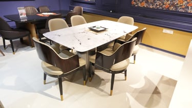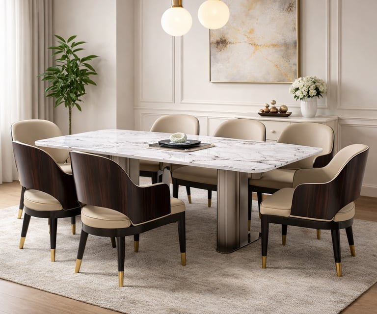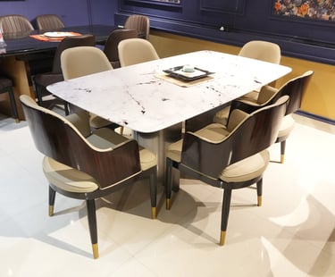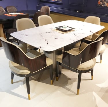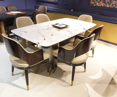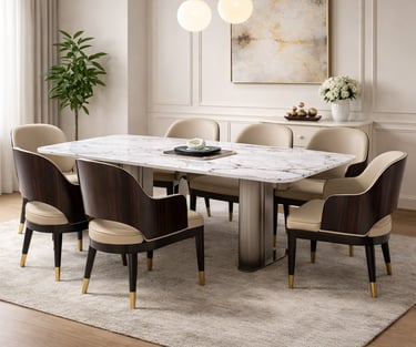 Product description: The S205 / 2053 / 6099 5D Marble Dining Set (1+6) is crafted to deliver bold visual depth, premium elegance, and everyday comfort for modern dining spaces. This sophisticated set includes one striking 5D marble dining table paired with six stylish dining chairs, making it ideal for family dining, celebrations, and upscale entertaining. The 5D marble tabletop features enhanced depth, rich veining, and a high-gloss polished finish that creates a luxurious, contemporary statement while remaining durable and easy to maintain. Supported by a strong and stable base, the table is built for long-term use. The six matching chairs are ergonomically designed with supportive backrests and sturdy construction, ensuring comfort during extended dining sessions. Perfect for modern, contemporary, and luxury interiors, Model S205 / 2053 / 6099 becomes a refined centerpiece that elevates the entire dining ambience.