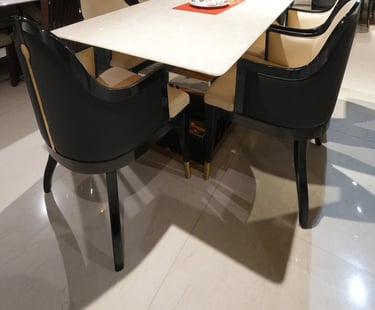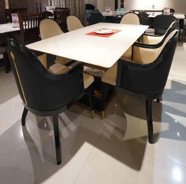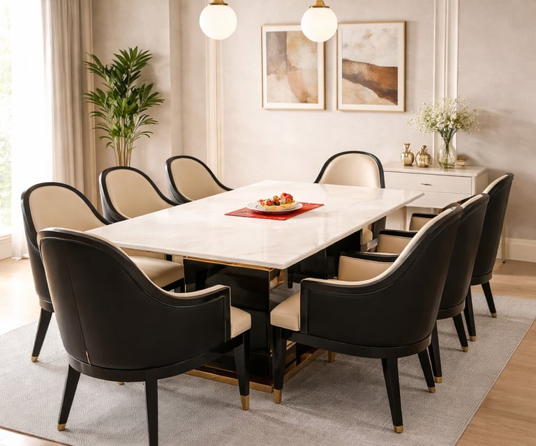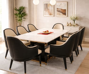 Product description: The S209 / 287-6 / 287-13 Onyx Marble Dining Set (1+6) is a luxurious statement piece crafted for elegant dining spaces. This premium set includes one exquisite onyx marble dining table paired with six finely designed dining chairs, ideal for family meals, celebrations, and upscale entertaining. The onyx marble tabletop is distinguished by its rich natural patterns and subtle translucency, finished with a smooth, polished surface that adds dramatic sophistication to your dining room. A strong, stable base ensures durability and long-term performance. The six matching chairs are ergonomically designed with supportive backrests and sturdy construction, offering comfort for extended dining experiences. Perfect for luxury, contemporary, and designer interiors, Model S209 / 287-6 / 287-13 elevates your dining area with timeless elegance and premium craftsmanship.