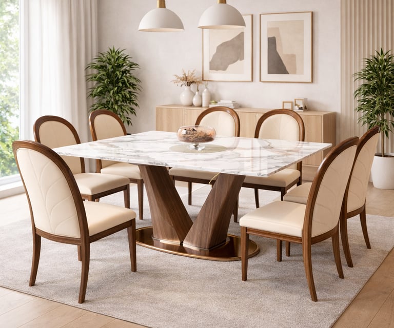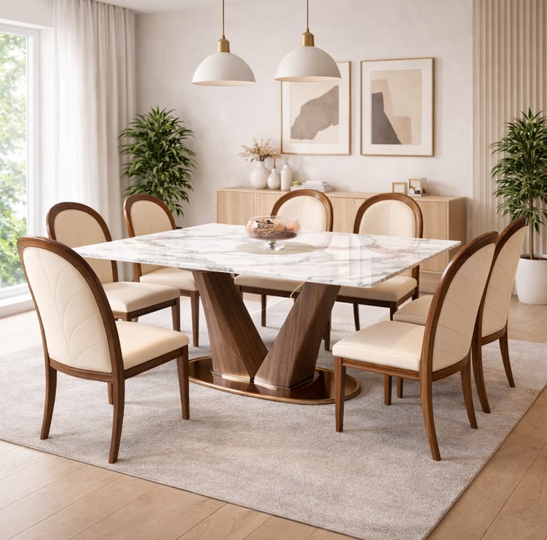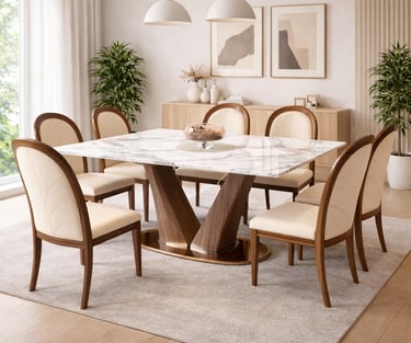 Product description: The SY22517 / 6058 Marble Dining Set (1+8) is designed for grand dining spaces that demand elegance, scale, and premium craftsmanship. This luxurious set includes one expansive marble dining table paired with eight stylish dining chairs, making it ideal for large families, formal dining, and sophisticated entertaining. The natural marble tabletop features a smooth, polished finish that highlights the unique veining and natural beauty of the stone, creating a striking centerpiece for your dining area. Built on a strong and stable base, the table ensures durability and long-lasting performance. The eight matching chairs are ergonomically designed with supportive backrests and sturdy construction, offering comfort even during extended dining occasions. Perfect for modern, contemporary, and luxury interiors, Model SY22517 / 6058 elevates the ambience of spacious dining rooms with timeless appeal and refined design.