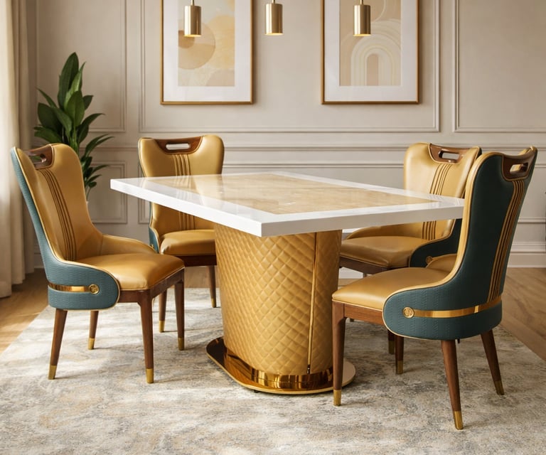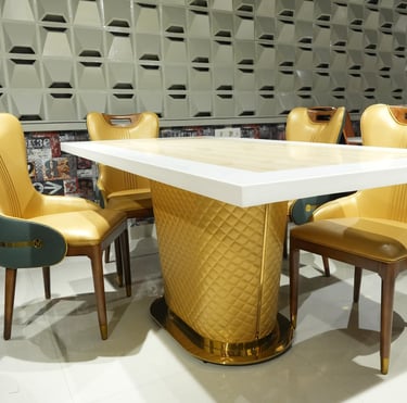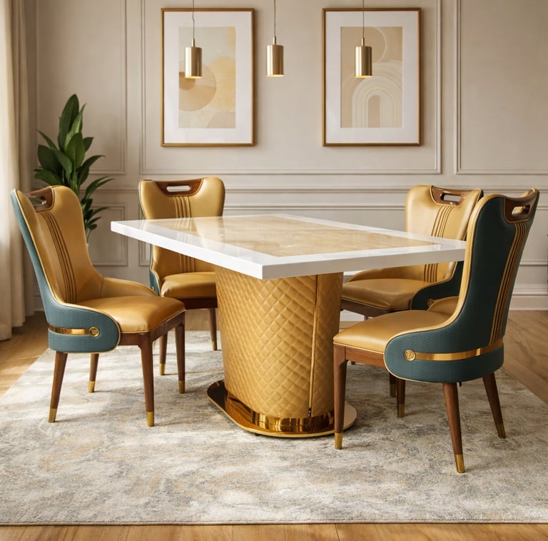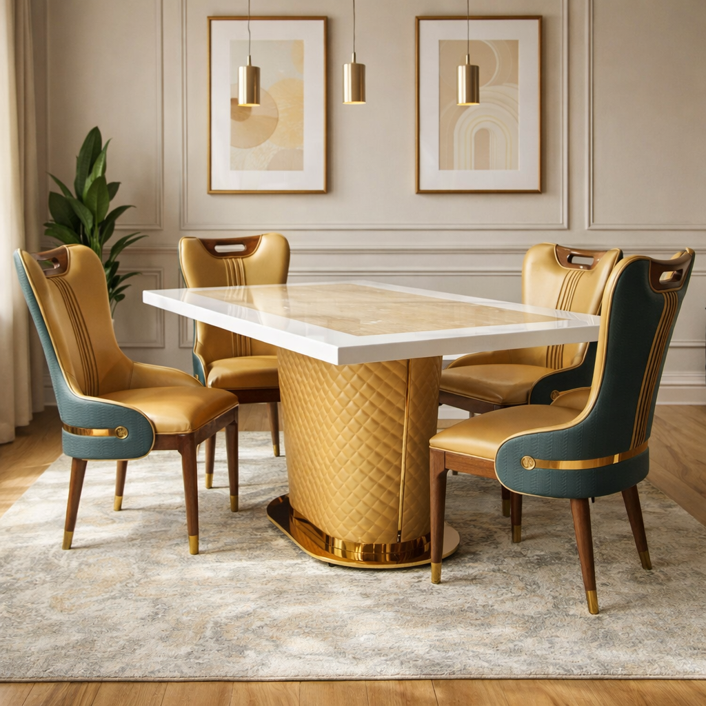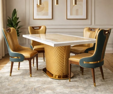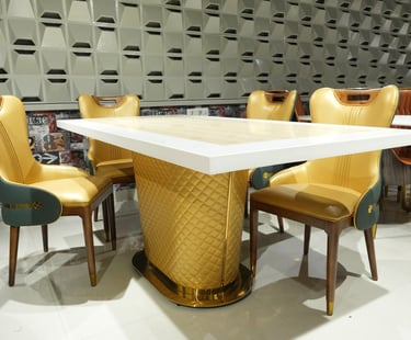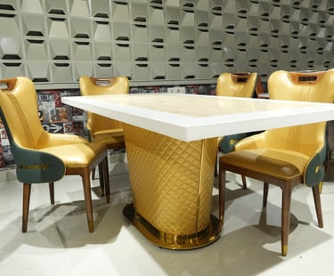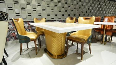 Product description: The T-6688 / 457 Marble Dining Set (1+6) is designed to bring timeless elegance and premium craftsmanship to spacious dining areas. This sophisticated set includes one marble dining table paired with six comfortable dining chairs, making it ideal for family dining, celebrations, and formal gatherings. The natural marble tabletop features a smooth, polished finish that highlights the unique beauty of stone while offering durability and easy maintenance. Supported by a strong, stable base, the table is built for long-lasting use. The six matching chairs are ergonomically designed with supportive backrests and sturdy construction, ensuring comfort during extended meals. Perfect for modern, contemporary, and luxury interiors, Model T-6688 / 457 serves as a refined centerpiece that enhances the overall dining experience.