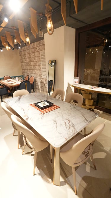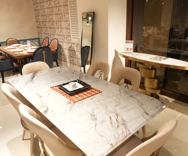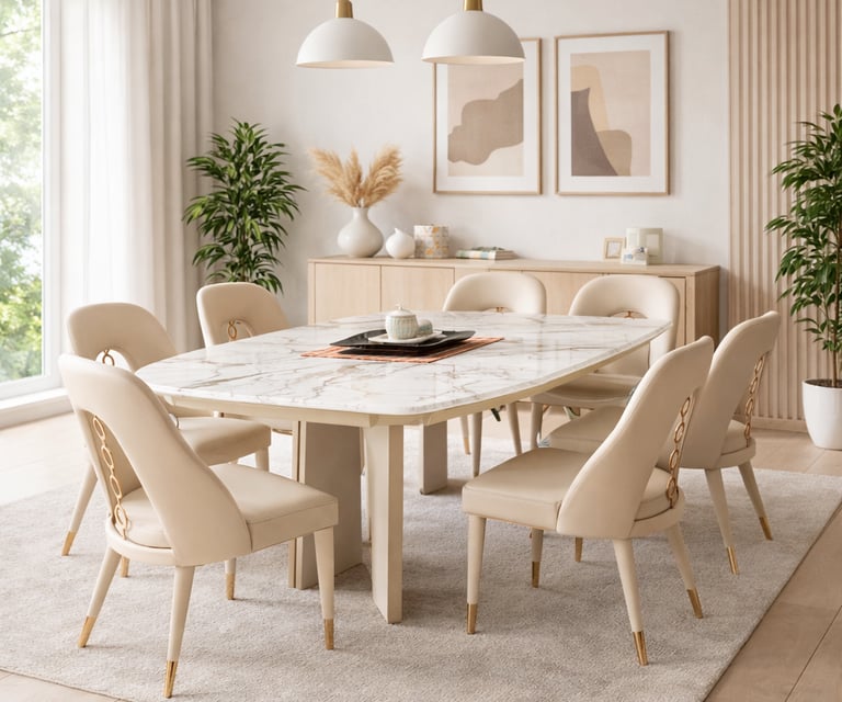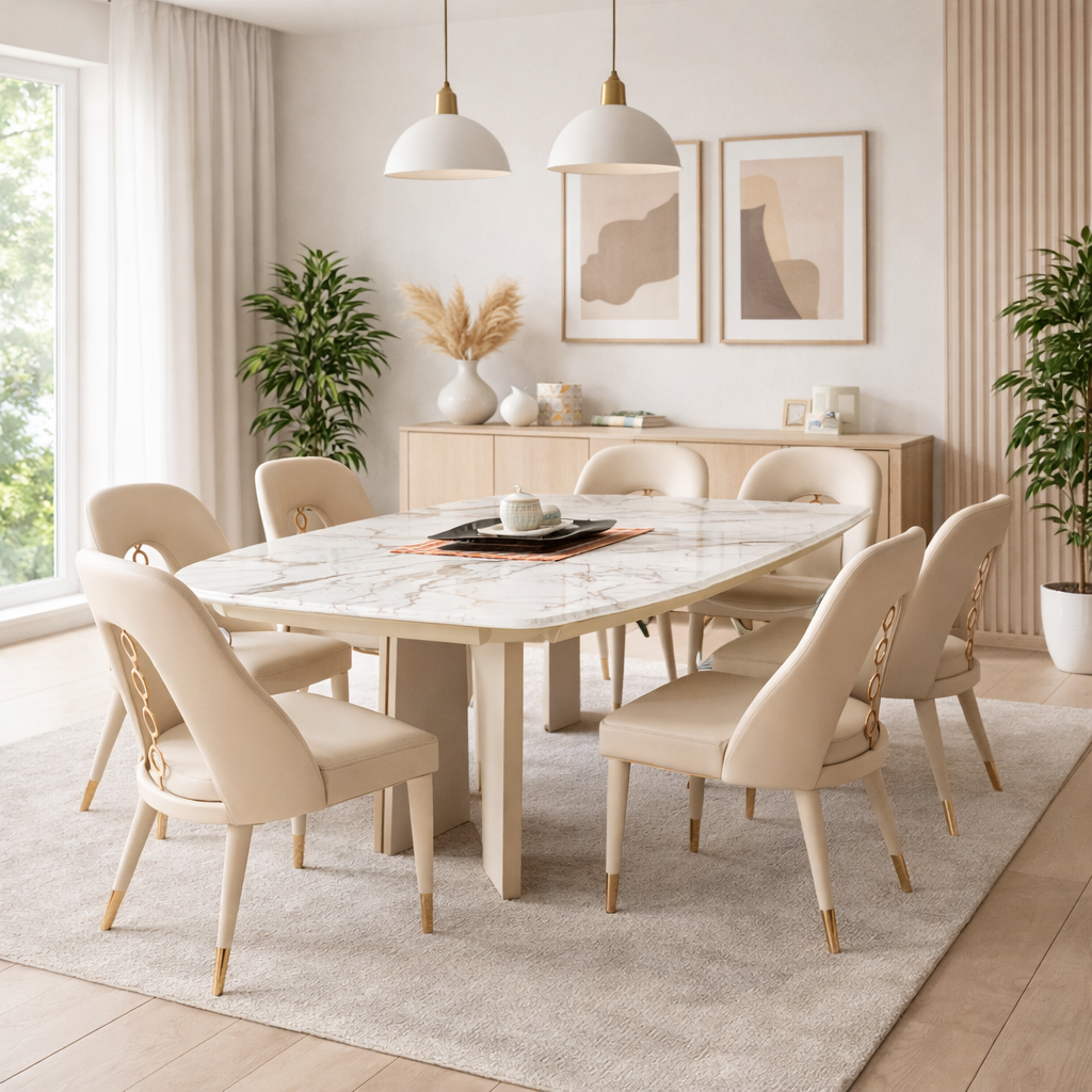 Product description: The T2251 / FWIT / C-399 5D Marble Dining Set (1+6) is designed to make a bold luxury statement with enhanced depth, rich detailing, and refined comfort. This premium set includes one striking 5D marble dining table paired with six elegantly designed dining chairs, making it ideal for family dining, special occasions, and upscale entertaining. The 5D marble tabletop features advanced depth effects, pronounced veining, and a high-gloss polished finish that delivers a dramatic, contemporary look while remaining durable and easy to maintain. Supported by a strong, stable base, the table ensures long-lasting performance. The six matching chairs are ergonomically designed with supportive backrests and sturdy construction, offering excellent comfort for extended meals. Perfect for modern, contemporary, and luxury interiors, Model T2251 / FWIT / C-399 serves as a sophisticated centerpiece that elevates the entire dining ambience.