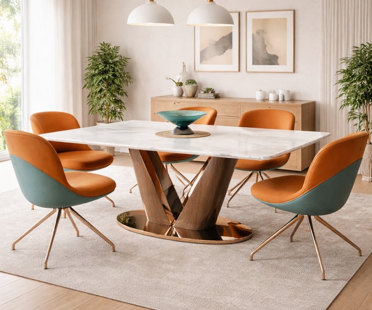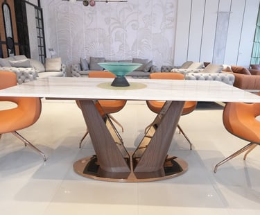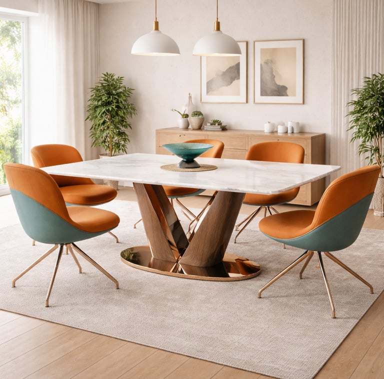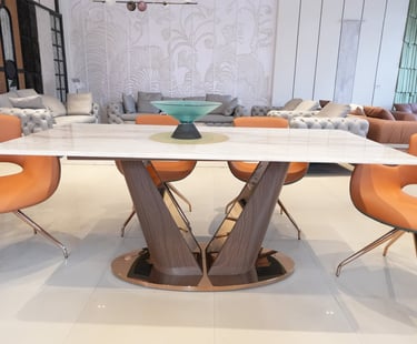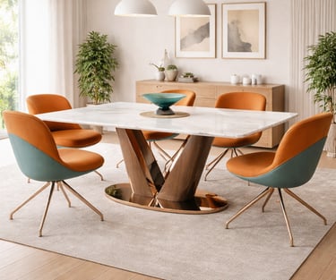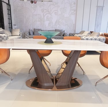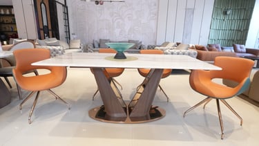 Product description: The T2310 + 3102 / C-6158-A Marble Dining Set (1+6) is designed to bring timeless sophistication, premium craftsmanship, and everyday comfort to your dining space. This elegant set includes one beautifully crafted marble dining table paired with six comfortable dining chairs, making it ideal for family meals, social gatherings, and formal entertaining. The natural marble tabletop features a smooth, polished finish that highlights the unique veining and character of the stone, creating a luxurious focal point while remaining durable and easy to maintain. Supported by a strong and stable base, the table ensures long-lasting performance. The six matching chairs are ergonomically designed with supportive backrests and sturdy construction, providing comfort during extended dining experiences. Perfect for modern, contemporary, and luxury interiors, Model T2310 + 3102 / C-6158-A serves as a refined centerpiece that elevates the overall ambience of your dining room.