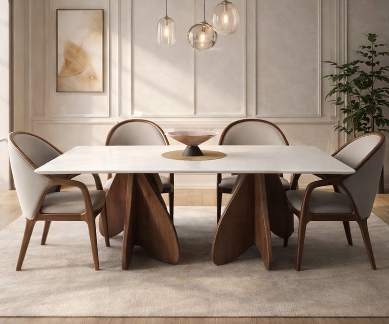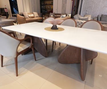 Product description: The T25-5 / CH-253 (9558) Marble Dining Set (1+6) is crafted to bring timeless elegance, premium materials, and everyday comfort to your dining space. This refined set includes one beautifully finished marble dining table paired with six comfortable dining chairs, making it ideal for family dining, celebrations, and formal entertaining. The natural marble tabletop features a smooth, polished finish that highlights the unique veining and character of the stone, creating a luxurious focal point while remaining durable and easy to maintain. Supported by a strong and stable base, the table ensures long-lasting performance. The six matching chairs are ergonomically designed with supportive backrests and sturdy construction, offering comfort during extended dining experiences. Perfect for modern, contemporary, and luxury interiors, Model T25-5 / CH-253 (9558) serves as an elegant centerpiece that enhances the overall ambience of your dining room.