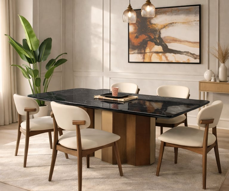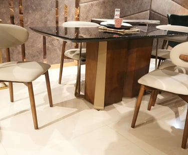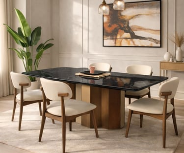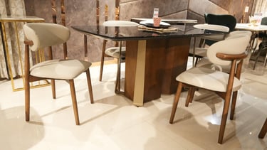 Product description: The T2505 / 0076 Marble Dining Set (1+6) is designed to bring timeless luxury, refined craftsmanship, and everyday comfort to your dining space. This elegant set includes one premium marble dining table paired with six stylish dining chairs, making it ideal for family dining, social gatherings, and formal entertaining. The natural marble tabletop features a smooth, polished finish that highlights the unique veining and beauty of the stone, adding a rich and sophisticated touch to your dining room. Supported by a strong and stable base, the table ensures durability and long-lasting performance. The six matching chairs are ergonomically designed with supportive backrests and sturdy construction, offering excellent comfort during extended meals. Perfect for modern, contemporary, and luxury interiors, Model T2505 / 0076 serves as a refined centerpiece that elevates the overall ambience of your dining area.