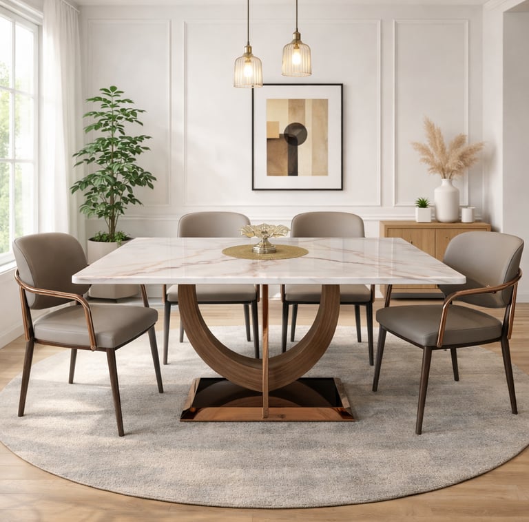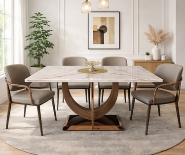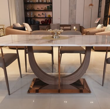 Product description: The T6818 + C31 / C-6958 Marble Dining Set (1+6) is designed to bring timeless elegance, premium craftsmanship, and everyday comfort to your dining space. This sophisticated set includes one beautifully crafted marble dining table paired with six comfortable dining chairs, making it ideal for family meals, celebrations, and formal entertaining. The natural marble tabletop features a smooth, polished finish that highlights the unique veining and natural character of the stone, creating a luxurious focal point while remaining durable and easy to maintain. Supported by a strong and stable base, the table ensures long-lasting performance. The six matching chairs are ergonomically designed with supportive backrests and sturdy construction, providing comfort during extended dining experiences. Perfect for modern, contemporary, and luxury interiors, Model T6818 + C31 / C-6958 serves as an elegant centerpiece that enhances the overall ambience of your dining room.