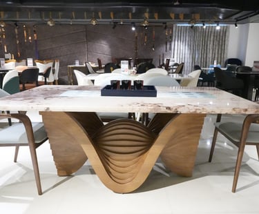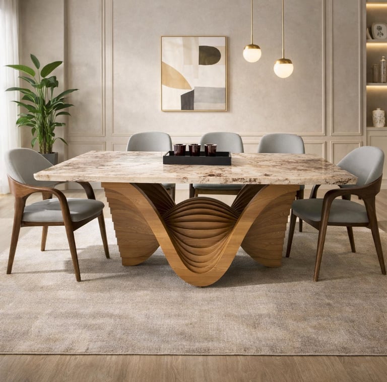 Product description: The T90 / 9613-2 / 251 Marble Dining Set (1+6) is designed to bring timeless elegance, premium materials, and everyday comfort to your dining space. This sophisticated set includes one beautifully crafted marble dining table paired with six comfortable dining chairs, making it ideal for family dining, celebrations, and formal entertaining. The natural marble tabletop features a smooth, polished finish that highlights unique stone veining, adding a luxurious touch while remaining durable and easy to maintain. Supported by a strong and stable base, the table ensures long-lasting performance. The six matching chairs are ergonomically designed with supportive backrests and sturdy construction, providing comfort for extended meals. Perfect for modern, contemporary, and luxury interiors, Model T90 / 9613-2 / 251 serves as a refined centerpiece that elevates the overall ambience of your dining room.