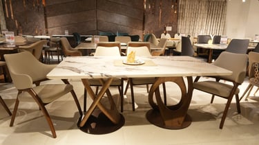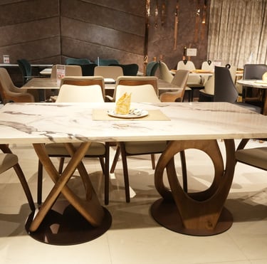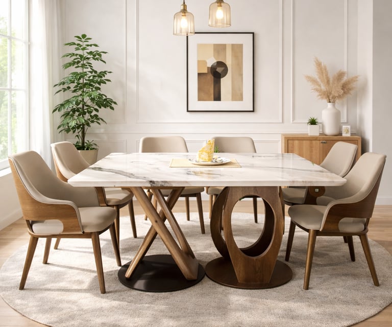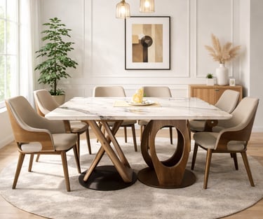 Product description: The T91 / 0053 / 8022 Marble Dining Set (1+6) is designed to add timeless elegance, premium craftsmanship, and everyday comfort to your dining space. This sophisticated set includes one beautifully finished marble dining table paired with six comfortable dining chairs, making it ideal for family dining, gatherings, and formal entertaining. The natural marble tabletop features a smooth, polished surface that highlights the unique veining and natural beauty of the stone, creating a luxurious focal point while remaining durable and easy to maintain. Supported by a strong and stable base, the table ensures long-lasting performance. The six matching chairs are ergonomically designed with supportive backrests and sturdy construction, providing comfort during extended meals. Perfect for modern, contemporary, and luxury interiors, Model T91 / 0053 / 8022 serves as an elegant centerpiece that enhances the overall ambience of your dining room.