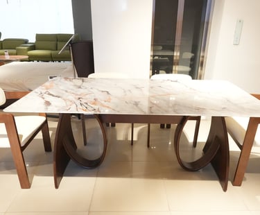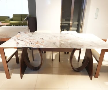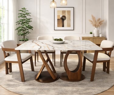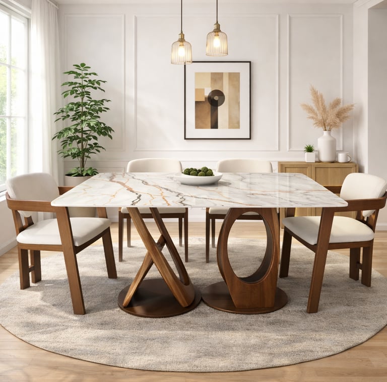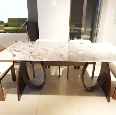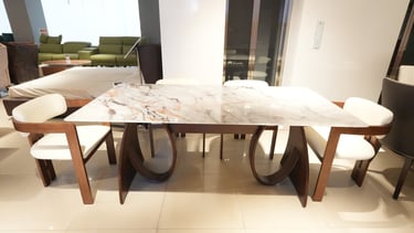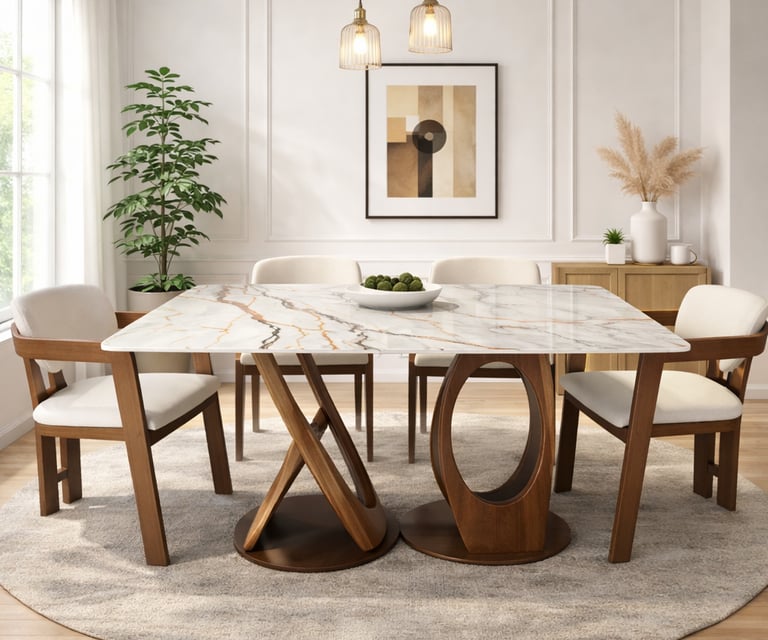 Product description: The T91 / 033 / 116# 5D Marble Dining Set (1+6) is crafted to deliver striking visual depth, premium elegance, and everyday comfort for modern dining spaces. This sophisticated set includes one luxurious 5D marble dining table paired with six stylish dining chairs, making it ideal for family dining, celebrations, and upscale entertaining. The 5D marble tabletop features enhanced depth, rich veining, and a high-gloss polished finish that creates a bold, contemporary statement while remaining durable and easy to maintain. Supported by a strong and stable base, the table ensures long-lasting performance. The six matching chairs are ergonomically designed with supportive backrests and sturdy construction, offering excellent comfort during extended meals. Perfect for modern, contemporary, and luxury interiors, Model T91 / 033 / 116# becomes a refined centerpiece that elevates the entire dining ambience.