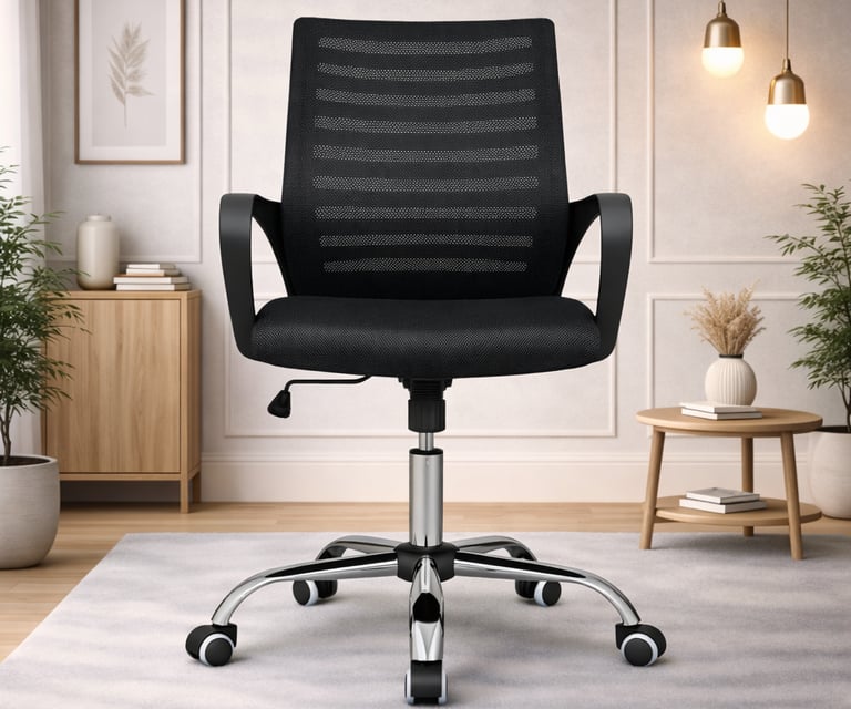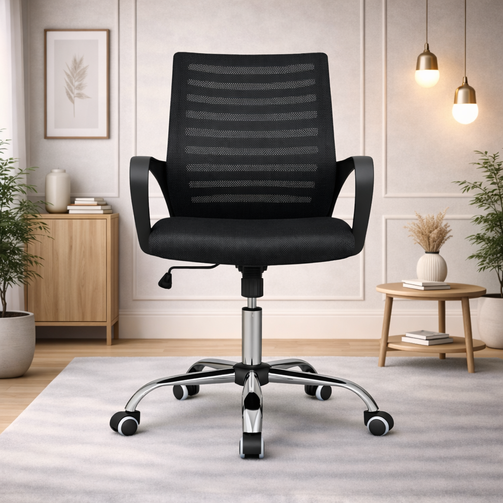 Product description: The Revolving Chair Model Number: 903 is This office chair is designed to provide comfortable and supportive seating for long working hours. It features an ergonomic backrest that helps maintain proper posture and reduces strain on the spine. The chair is crafted with a sturdy frame and high-quality cushioning to ensure durability and long-lasting comfort. Its modern and professional design makes it suitable for offices, workstations, cabins, and home office setups. The smooth finish and premium upholstery add a stylish touch while enhancing user convenience and productivity throughout the day.