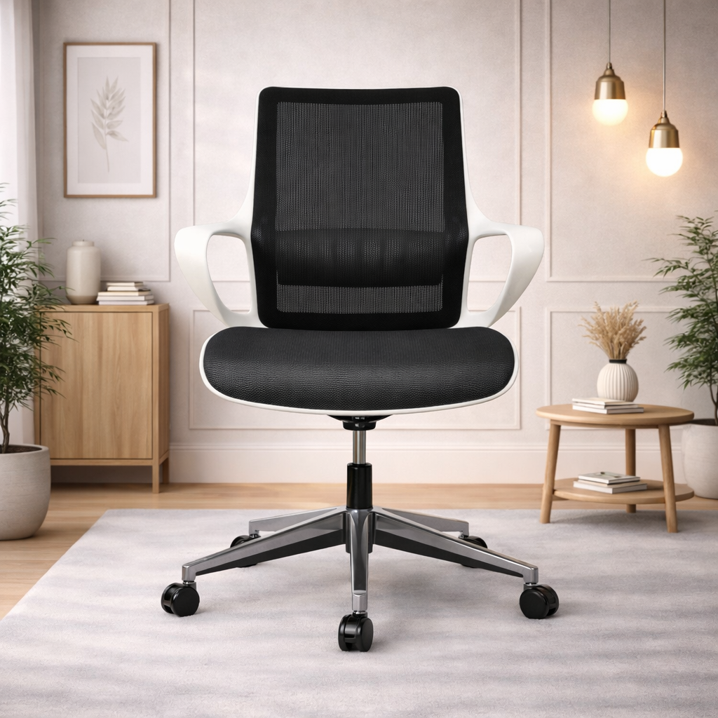 Product description: The Revolving Chair Model Number: D801-1 is This office chair is designed to provide comfortable and supportive seating for long working hours. It features an ergonomic backrest that helps maintain proper posture and reduces strain on the spine. The chair is crafted with a sturdy frame and high-quality cushioning to ensure durability and long-lasting comfort. Its modern and professional design makes it suitable for offices, workstations, cabins, and home office setups. The smooth finish and premium upholstery add a stylish touch while enhancing user convenience and productivity throughout the day.