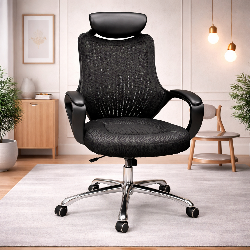 Product description: The Revolving Chair Model Number: W6823 is This office chair is designed to provide comfortable and supportive seating for long working hours. It features an ergonomic backrest that helps maintain proper posture and reduces strain on the spine. The chair is crafted with a sturdy frame and high-quality cushioning to ensure durability and long-lasting comfort. Its modern and professional design makes it suitable for offices, workstations, cabins, and home office setups. The smooth finish and premium upholstery add a stylish touch while enhancing user convenience and productivity throughout the day.