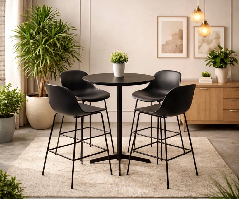 Product description: The H-3/108 Bar Chair Set with Table is designed to create a stylish and functional bar or high-seating area. Ideal for home bars, cafés, restaurants, and casual dining spaces, this set offers a comfortable seating experience paired with a compact and practical table. Its balanced proportions and ergonomic seating make it suitable for everyday use. Built with sturdy construction for stability and durability, the H-3/108 set is designed to withstand regular use in both residential and commercial environments. The modern design and clean finish allow it to blend seamlessly into contemporary interiors, adding a refined touch to any bar or counter space.