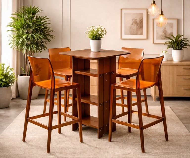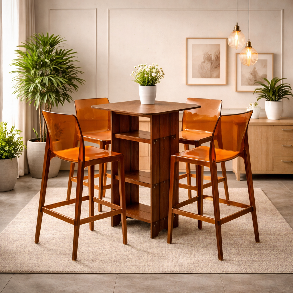Product description: The T225B-3/H-4 Bar Chair Set with Table is designed to create a stylish and functional bar or high-seating area. Ideal for home bars, cafés, restaurants, and casual dining spaces, this set offers a comfortable seating experience paired with a compact and practical table. Its balanced proportions and ergonomic seating make it suitable for everyday use. Built with sturdy construction for stability and durability, the H-3/108 set is designed to withstand regular use in both residential and commercial environments. The modern design and clean finish allow it to blend seamlessly into contemporary interiors, adding a refined touch to any bar or counter space.