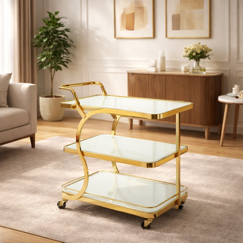 Product description: The A5 Serving Trolley is designed to deliver effortless serving with a clean, modern aesthetic. Practical and stylish, it’s ideal for dining rooms, living spaces, hotels, cafés, and restaurants, adding both convenience and elegance to your setup. Built with quality materials and a sturdy frame, the A5 features smooth-rolling wheels for easy movement and spacious shelves for serving food, beverages, or organizing essentials. Its versatile design blends seamlessly with modern and contemporary interiors.